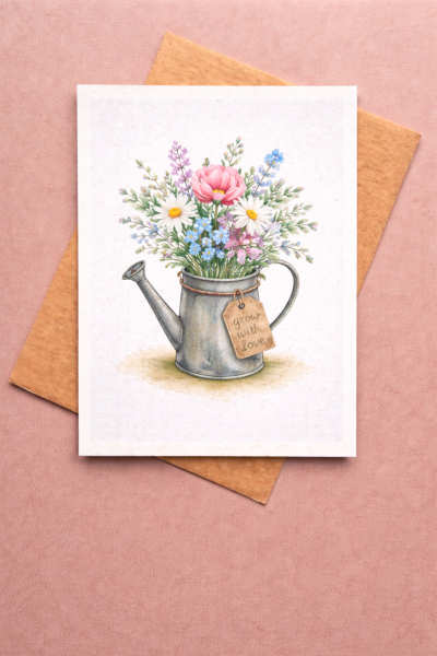 Nach dem Verschenken kann die Karte eingepflanzt werden. Das Papier löst sich auf, die Samen keimen und es wachsen echte Blumen.