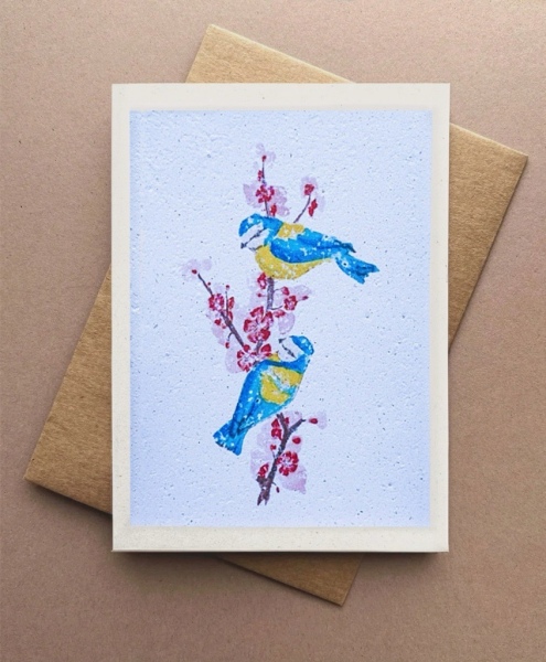 Nach dem Verschenken kann die Karte eingepflanzt werden. Das Papier löst sich auf, die Samen keimen und es wachsen echte Blumen.