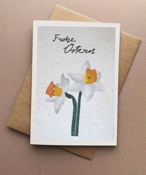 Nach dem Verschenken kann die Karte eingepflanzt werden. Das Papier löst sich auf, die Samen keimen und es wachsen echte Blumen.
